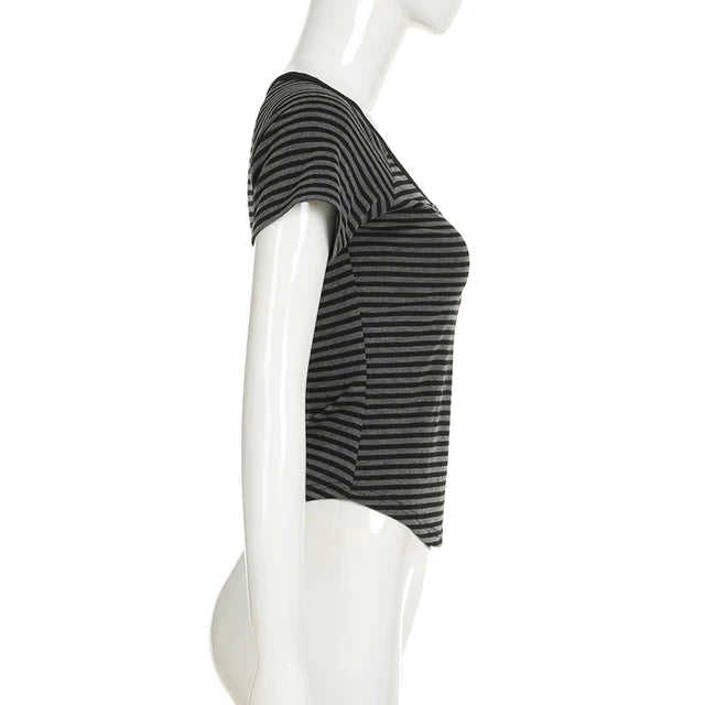 A Korean-inspired slim-fit V-neck T-shirt featuring classic stripes and stylish button details. This short-sleeve top combines Y2K aesthetics with modern comfort, perfect for summer casual wear, layering, or creating effortlessly chic outfits.